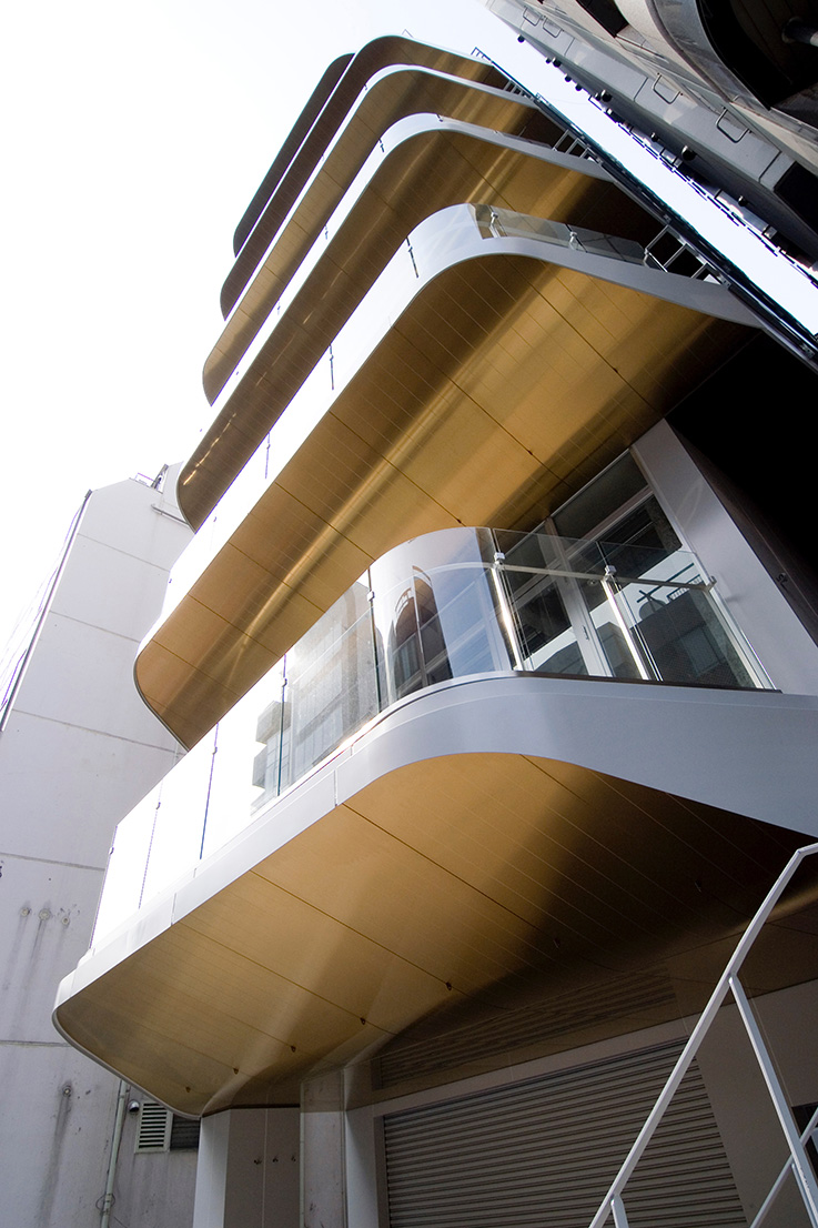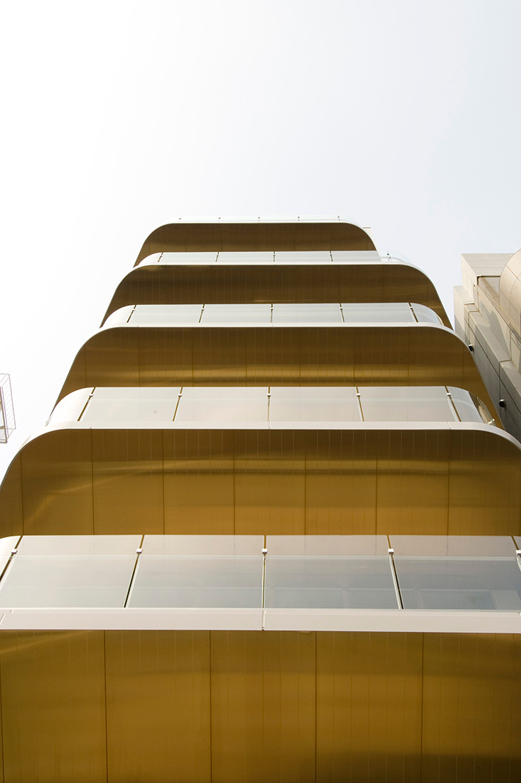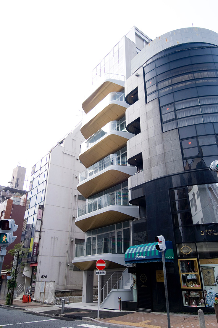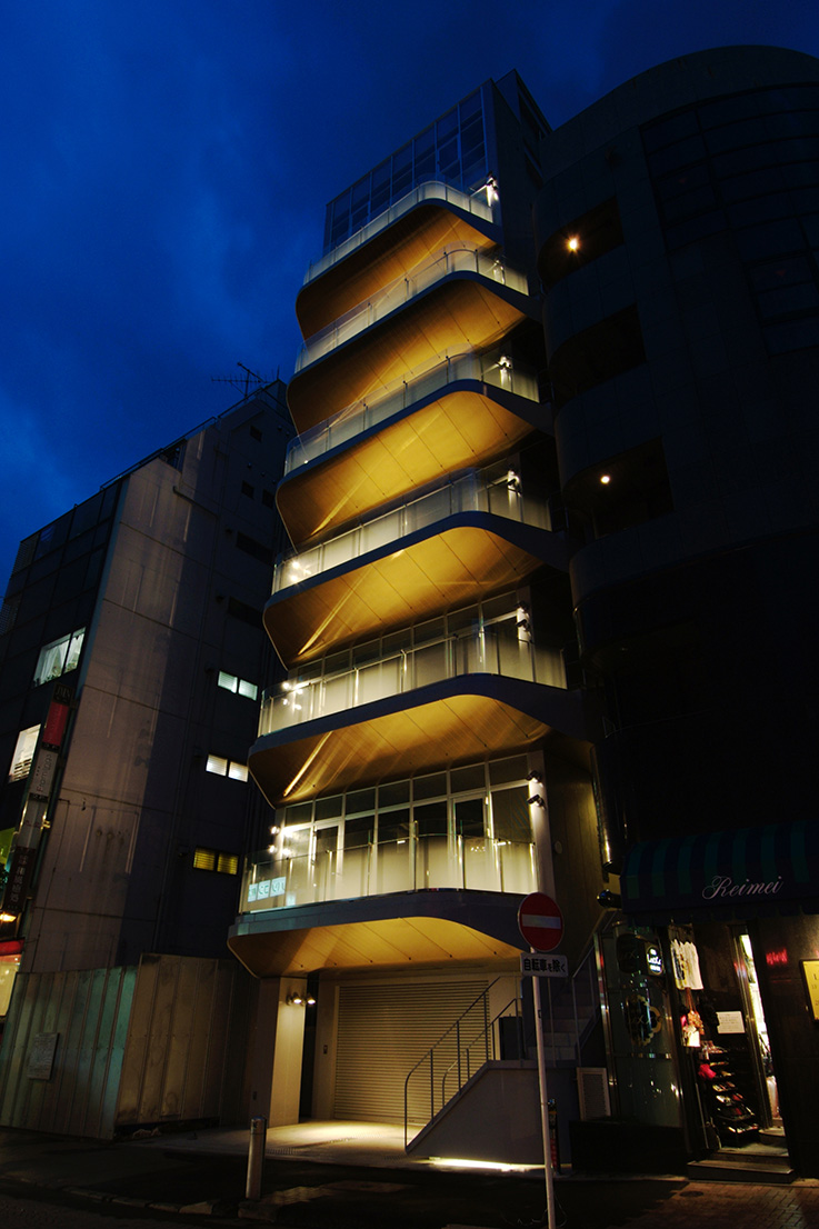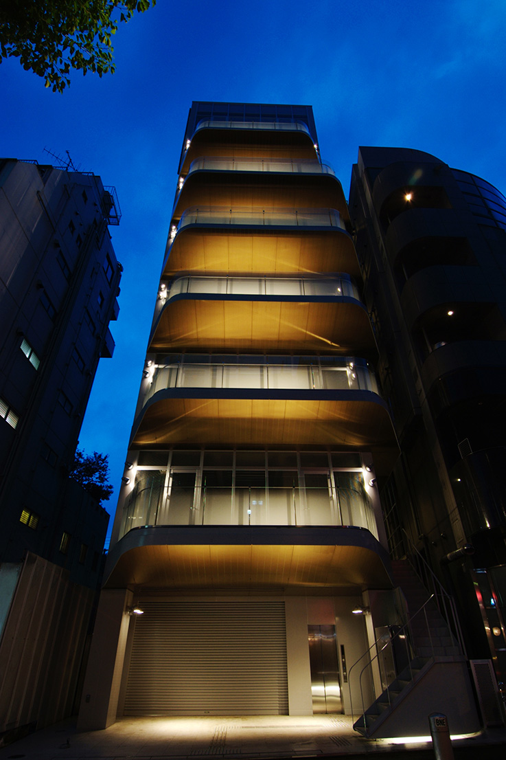 It was the commercial building project located at the corner of the crossing at the Azabujuban shopping street (Nine floors, steel structure and total floor:746 sqm). The building was designed the prosperity with stacking nine floors by street shops from the traditional shopping street. Every floor has the terrace which creates the highlighted facade in the popular district. The steel panels, fixed onto terrace soffits reflect the light and nightscape, therefore, show the gorgeous scene of the Minato district.
