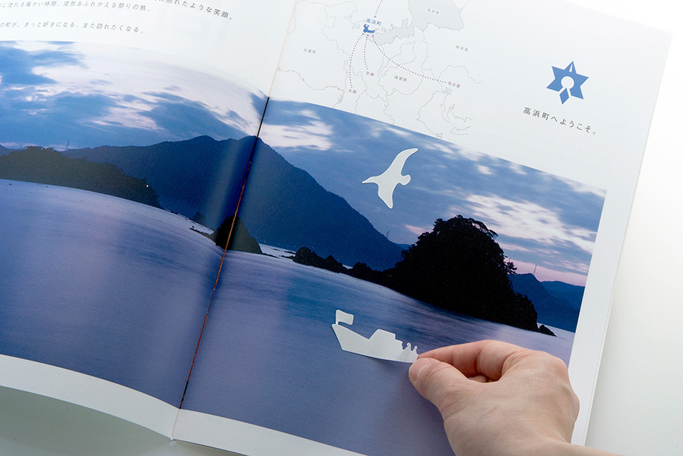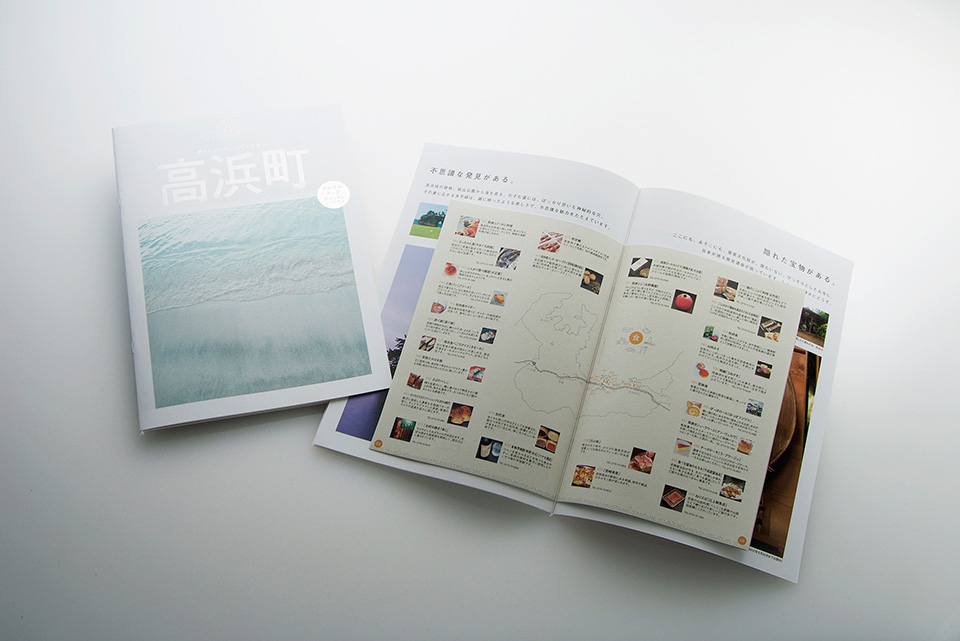 2008年から5年にわたり実施した福井県・高浜町での地域振興業務。様々なプロモーション活動、地域特産物など名物づくりの開発、都市計画や公共建築の改修案の作成など、多分野における総合的なコンサルティング業務を実施。その中でも製作を担当した公式パンフレットが、完成後3年が経ち、一般社団法人地域活性化センターが主催のイベントで全国 2334 点の中から栄えある第1位に選出される。