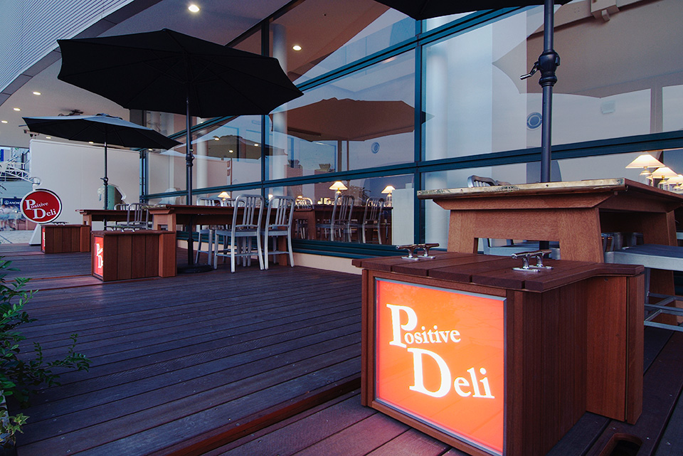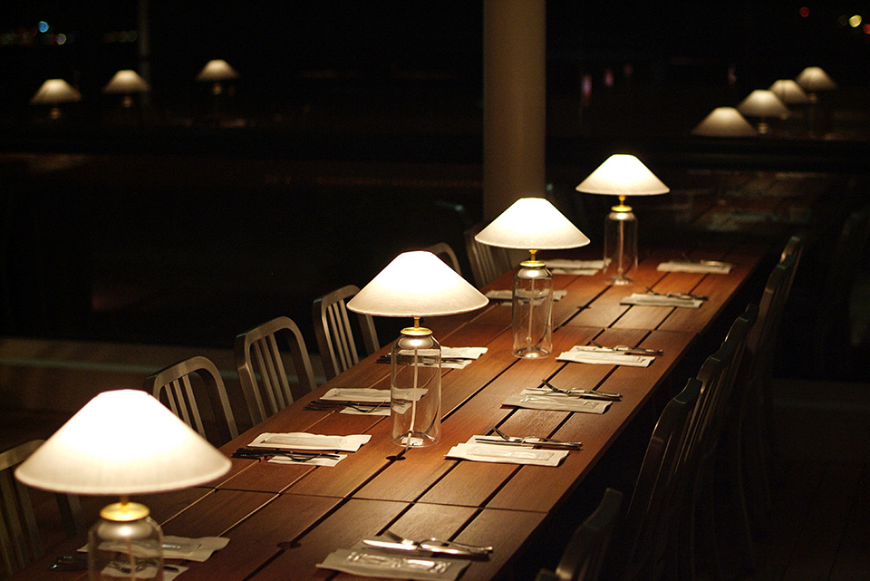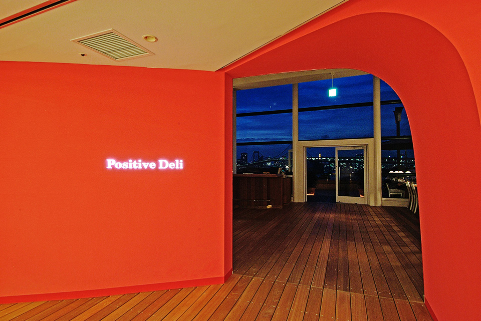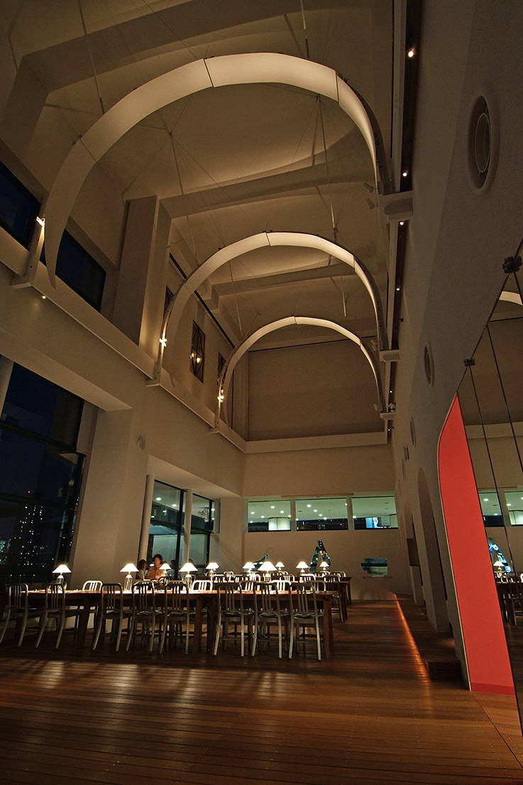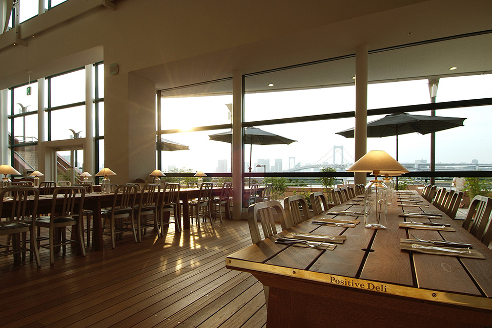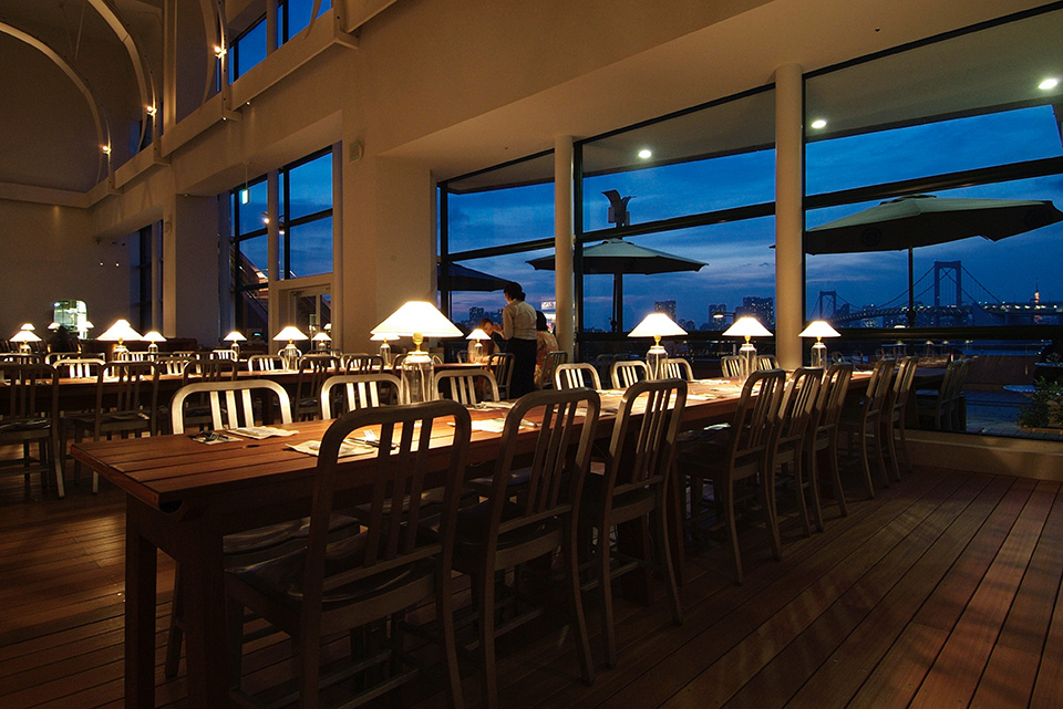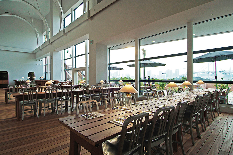 This is the renewal project of the cafe dining restaurant in Odaiba with the panoramic view of the Tokyo bay and the city of Tokyo. The proposals were not only for the restaurant use during the weekday, but also the space use for groups of visitors at the weekend. The interior with the 12m high spacious room has the relax atmosphere like an oversea resort and the exterior has the special terrace for cyclists and visitors with their pets. This space, for the small numbers of the neighbor during the weekday, turns into the venue for parties and wedding receptions at the weekend.